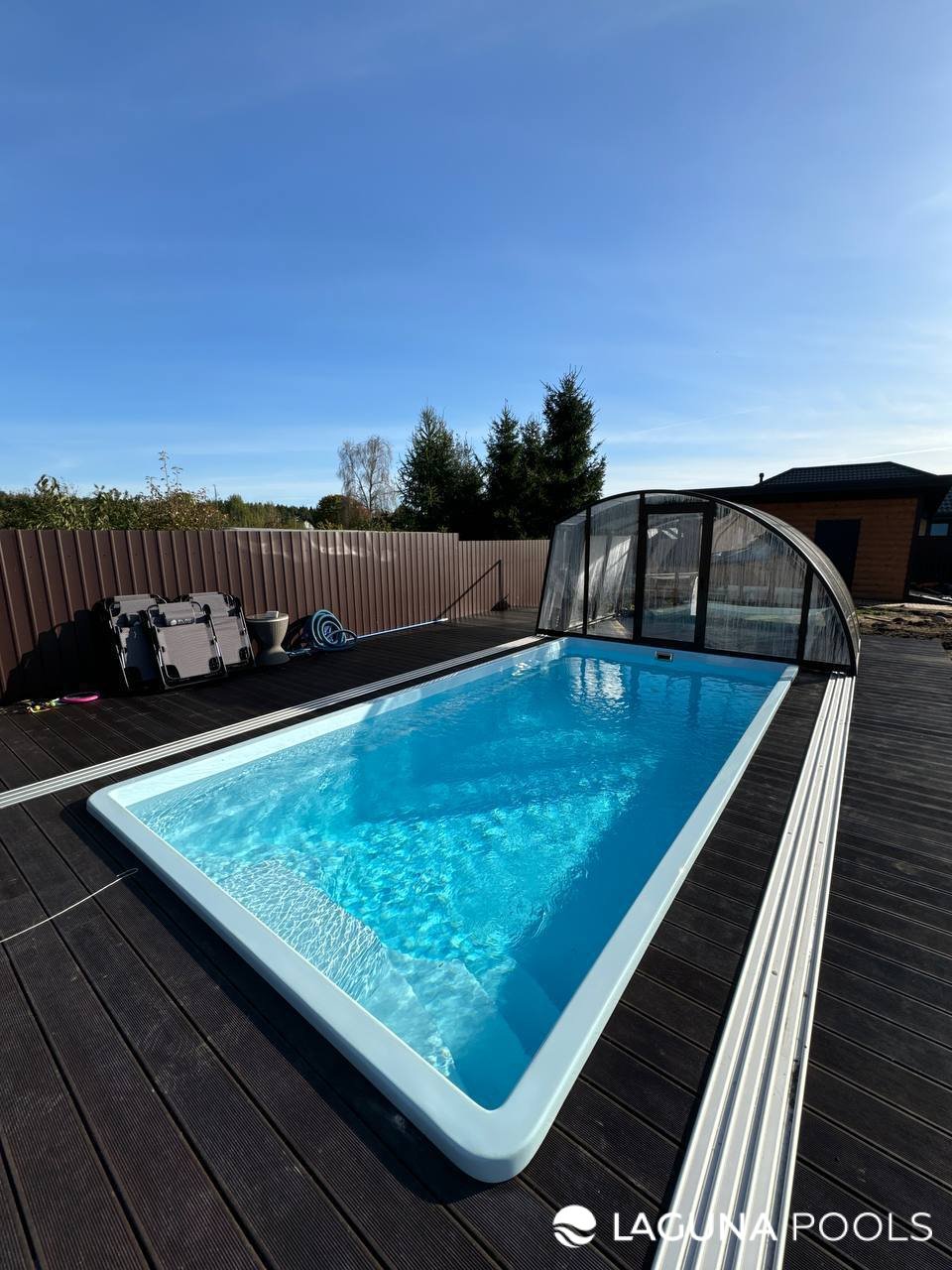 Композитный бассейн с сдвижным павильоном установлен на террасе из темного настила.